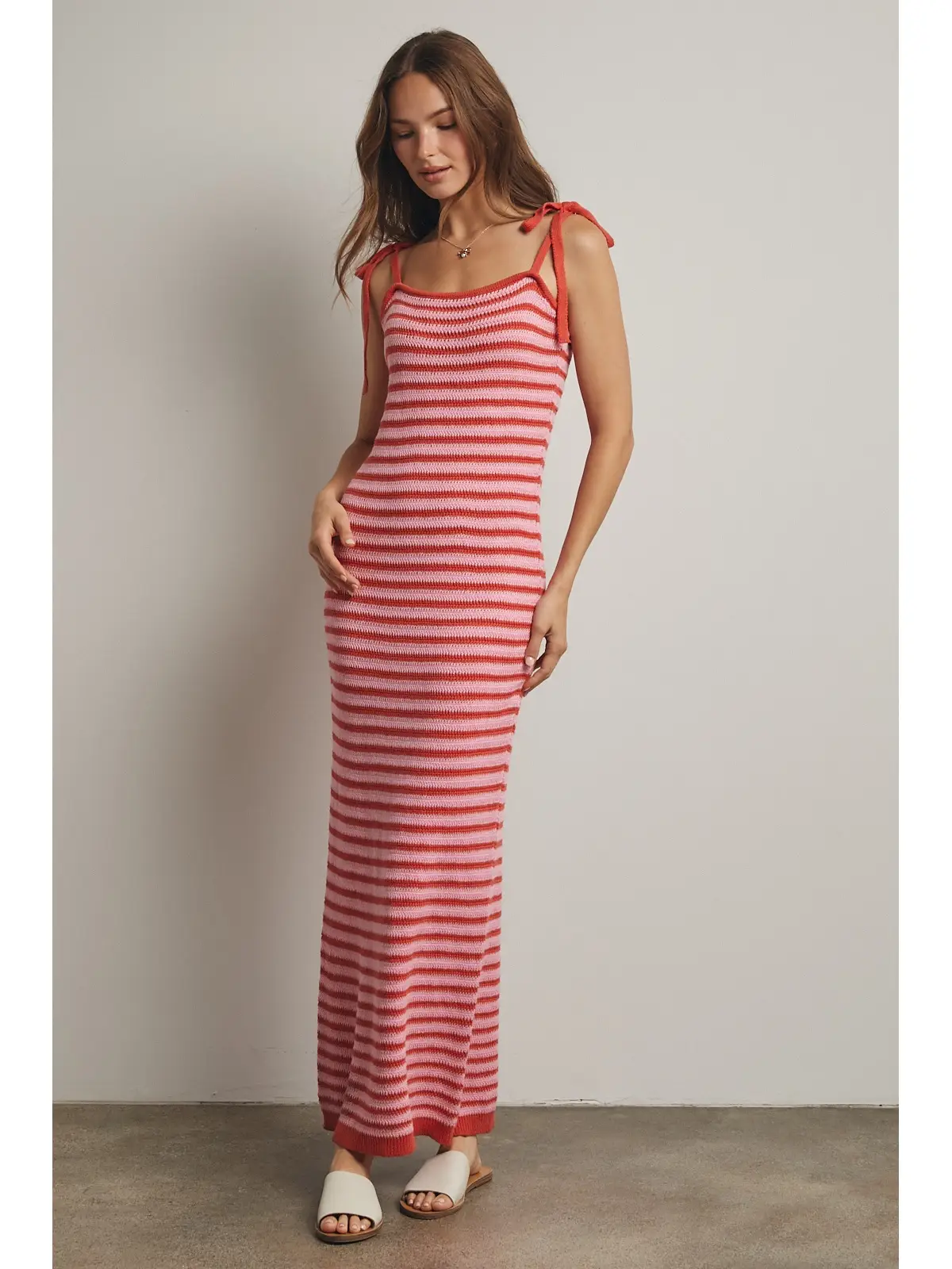pink and red striped knit maxi dress