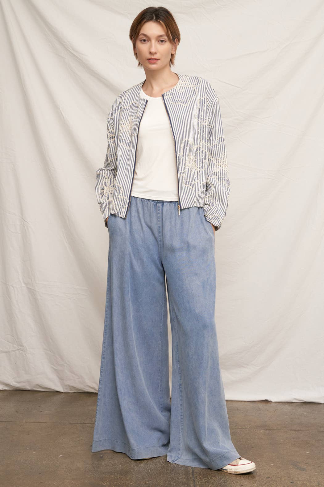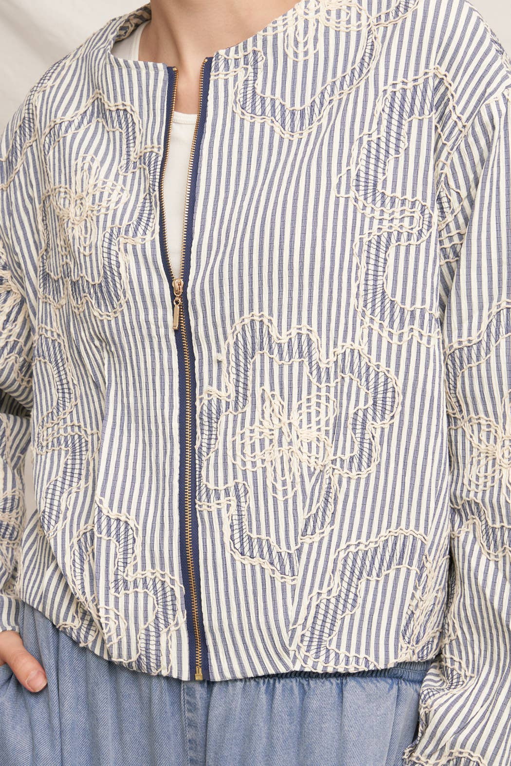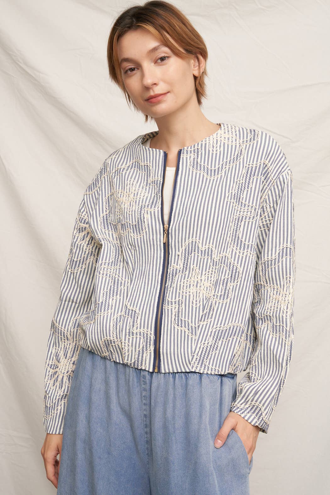 Striped Embroidered Floral Pattern Bomber Jacket Size S(2) - M(2) - L(2) Made in China * MODEL IS 5'8" AND IS WEARING A SMALL.