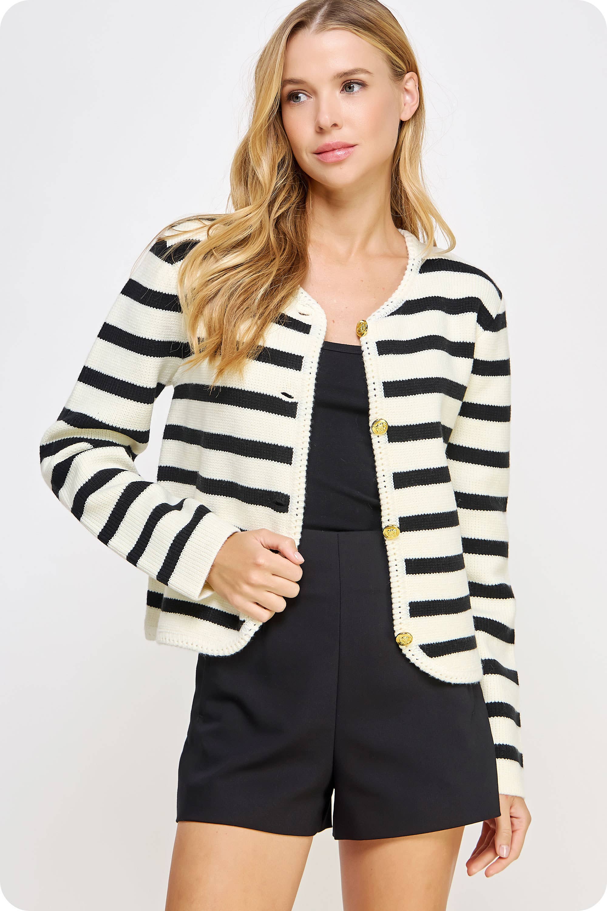 Studio Strut and Bolt Collection. Button down cardigan jacket sweater in knit fabric. This knitted style features gold button closure at front, braid trim throughout hem/neck, round neckline, and long sleeves.