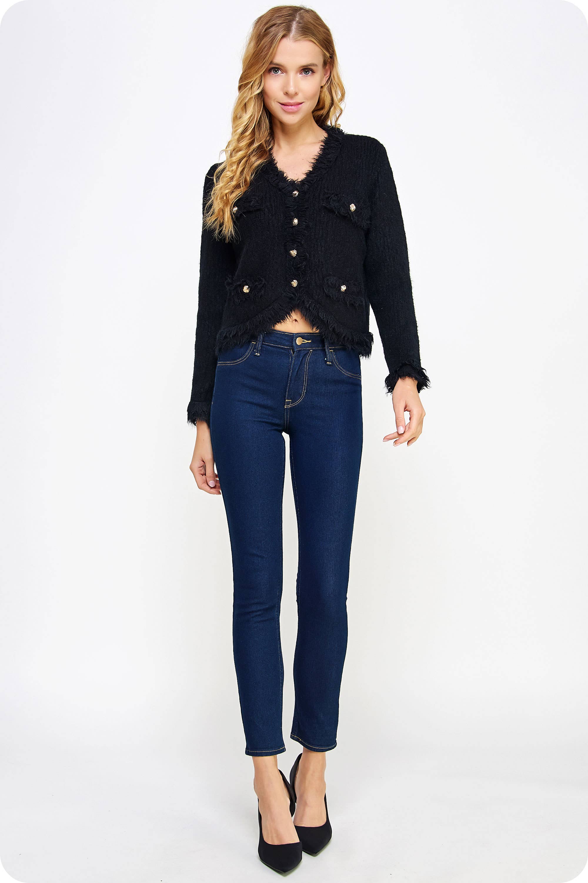 Frayed trim textured cardigan. Featuring layered frayed trim along neckline, cuffs, hemline, and front detailing- this textured knit cardigan has a v neck line with button down front and tulip hem line.
