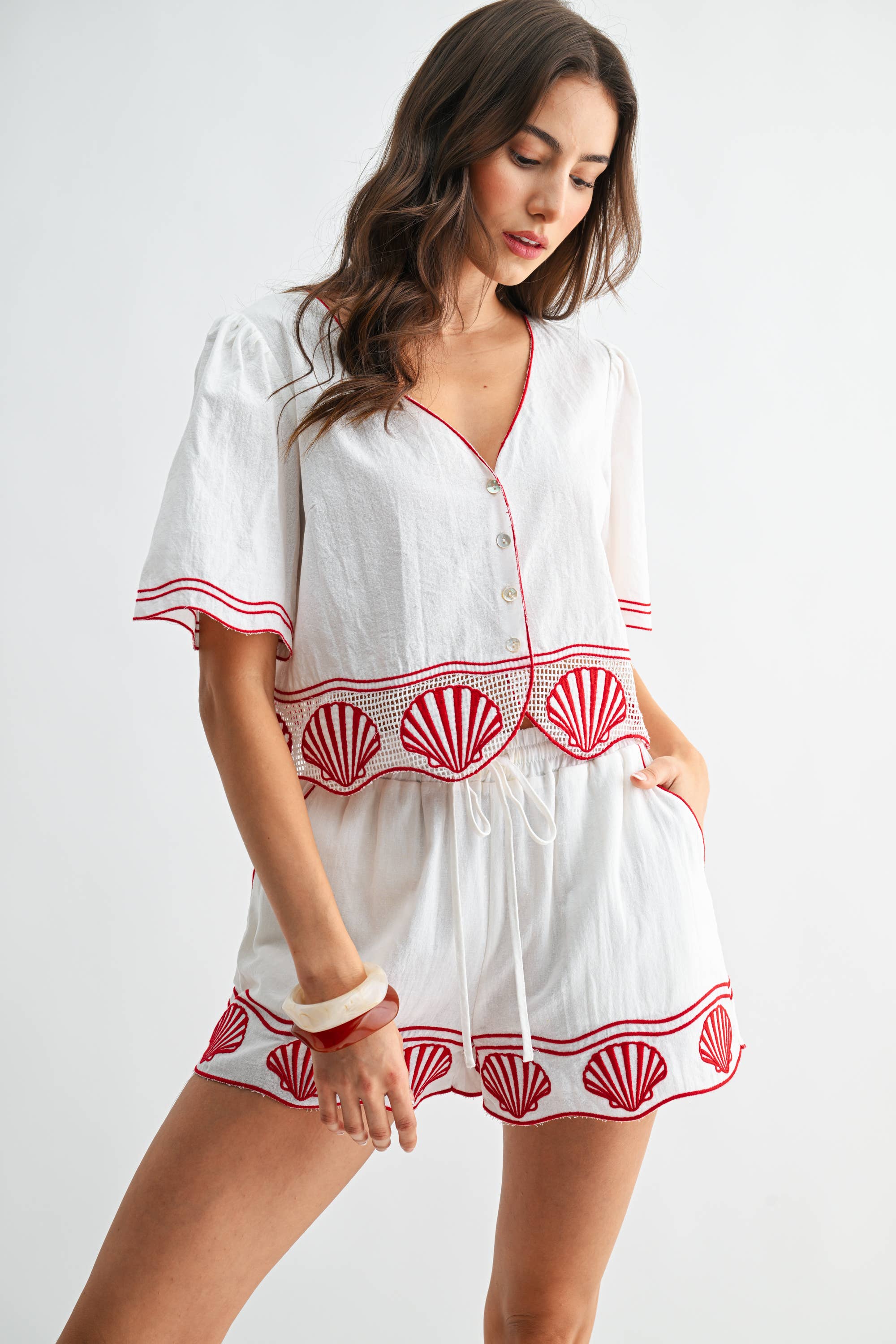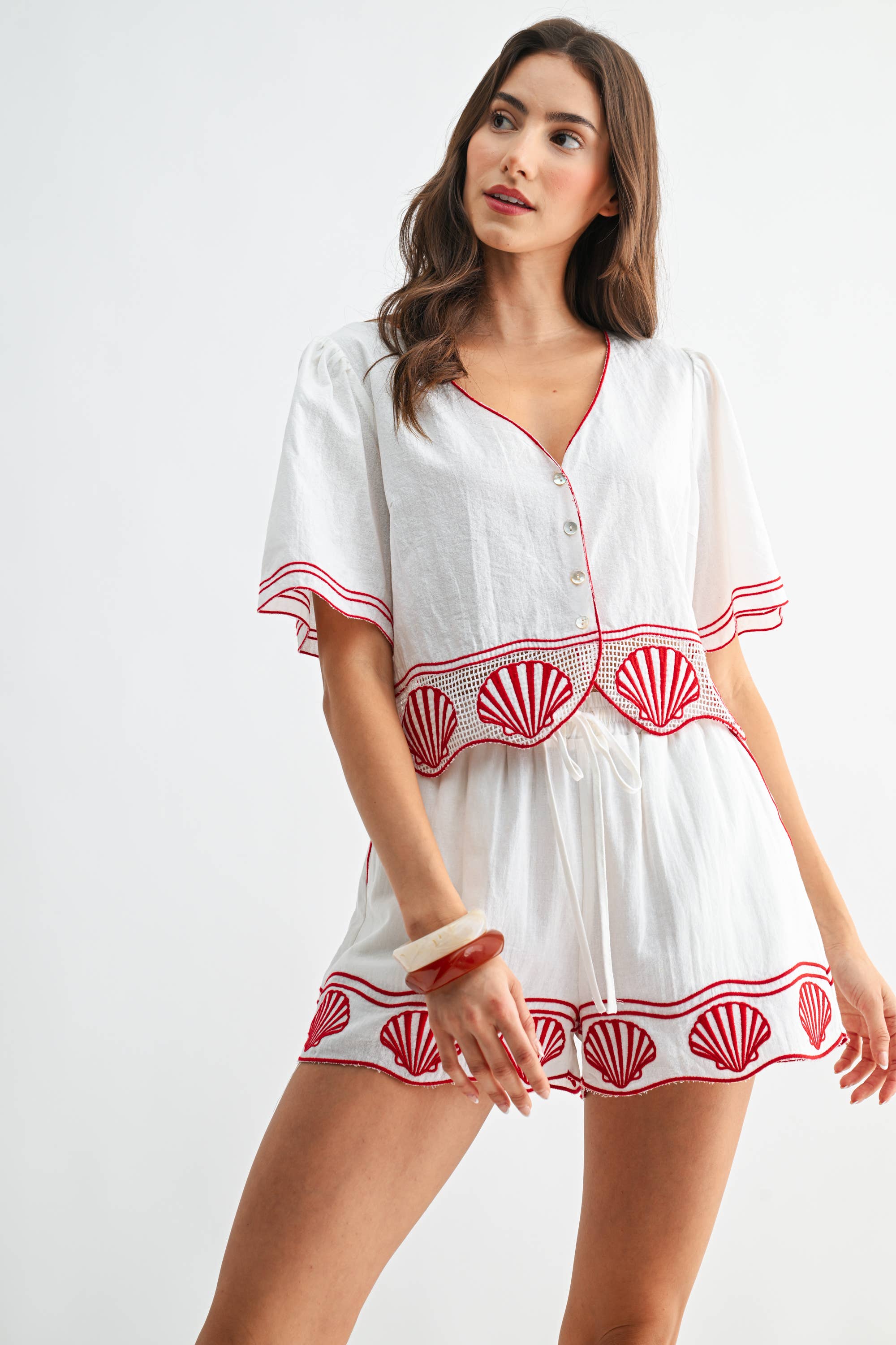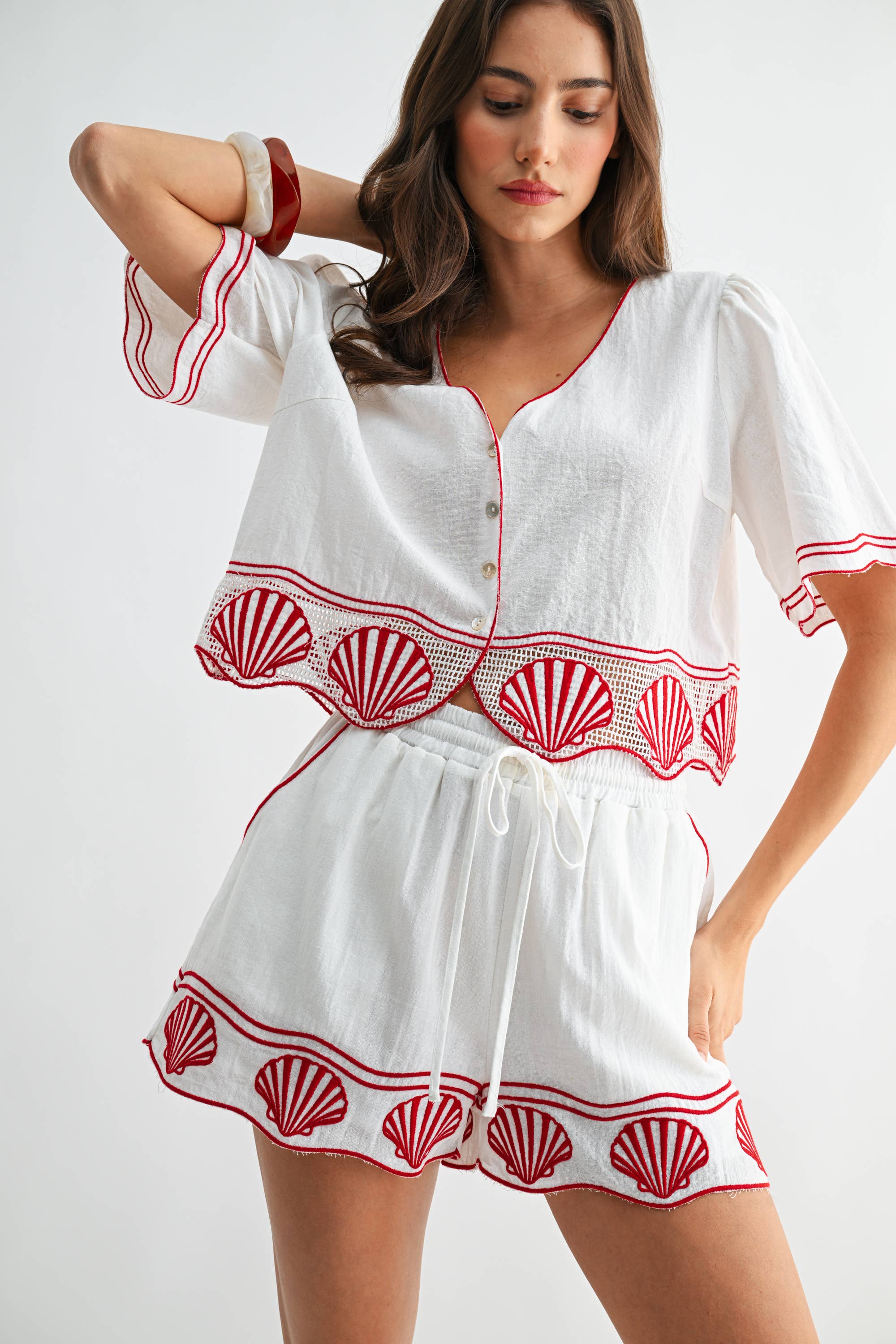 Experience a new standard in summer attire with this elegant white linen crop top, designed to seamlessly enhance both professional and leisure ensembles. Meticulously crafted for discerning individuals who appreciate fine details and luxurious materials, this top brings together crisp tailoring and exquisite blue embroidery for a truly distinctive look.