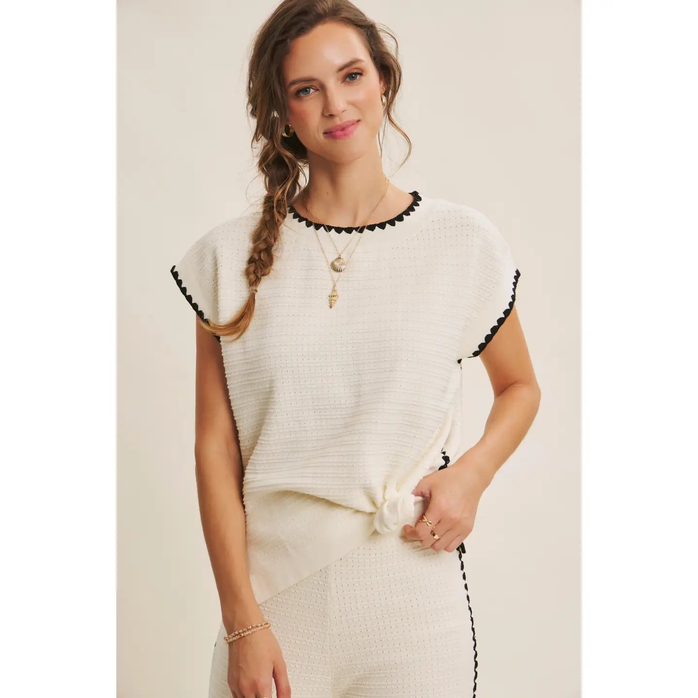 Ivory Knit Top with Black Trim. Pairs with Maison Ivory Knit pant
