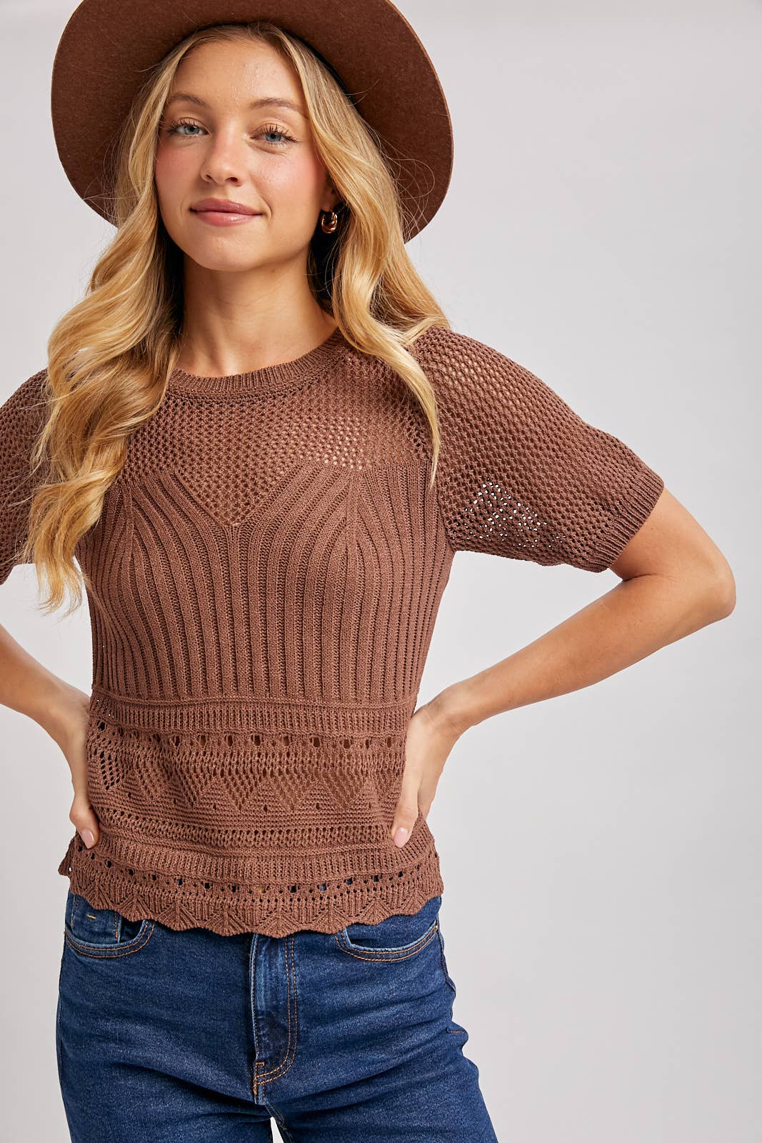 An open-knit short-sleeved sweater top designed for a light and airy feel. This top features a delicate open-knit pattern, making it perfect for layering over camisoles or bralettes for a breezy, summer-ready look. The short sleeves and relaxed fit ensure comfort and style, while the absence of lining enhances its sheer, breathable design. Ideal for pairing with denim shorts, skirts, or wide-leg pants, this versatile piece transitions effortlessly from beachwear to casual daytime outfits.
