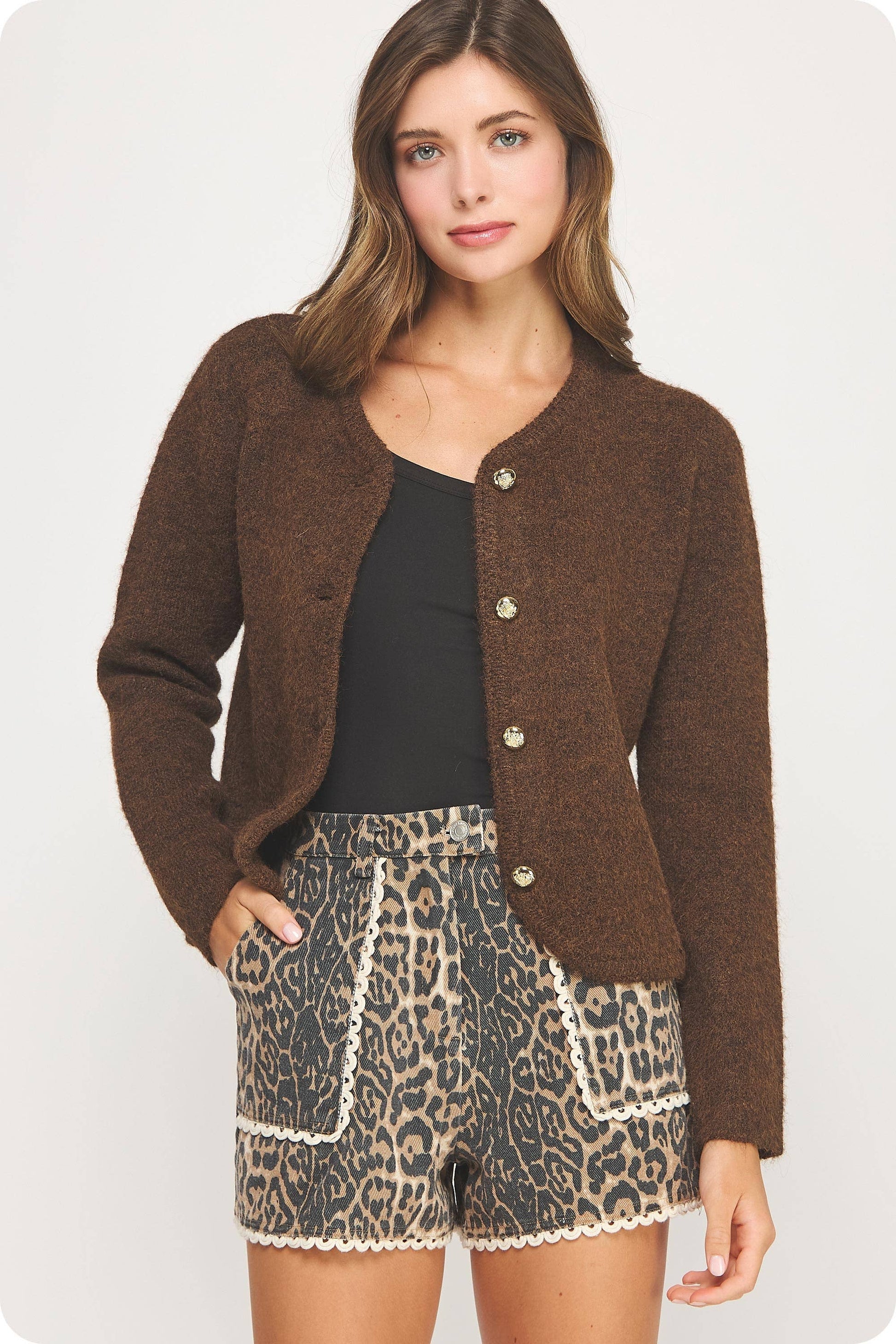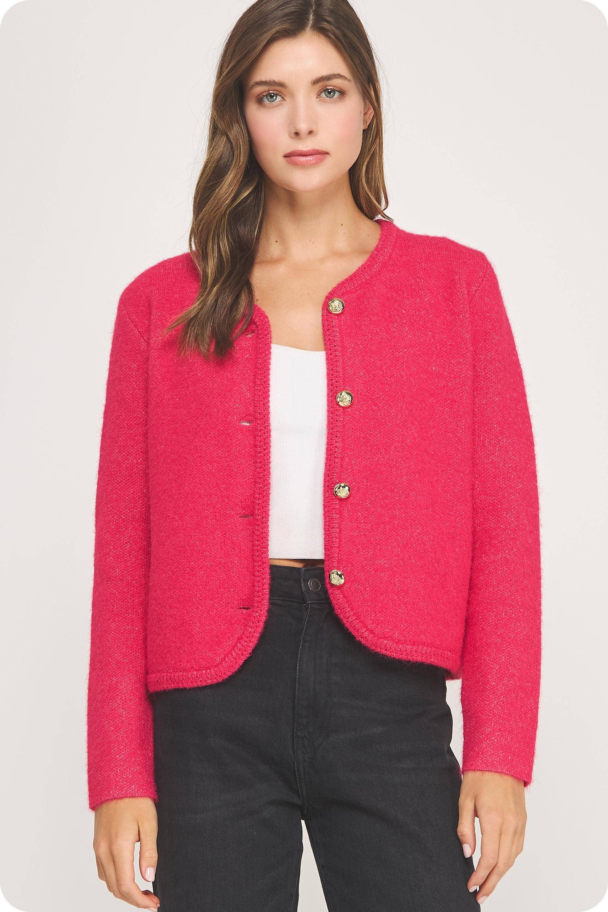 Studio Strut and Bolt Collection. Button down cardigan jacket sweater in knit fabric. This soft knitted style features gold button closure at front, braid trim throughout hem/neck, round neckline, and long sleeves.