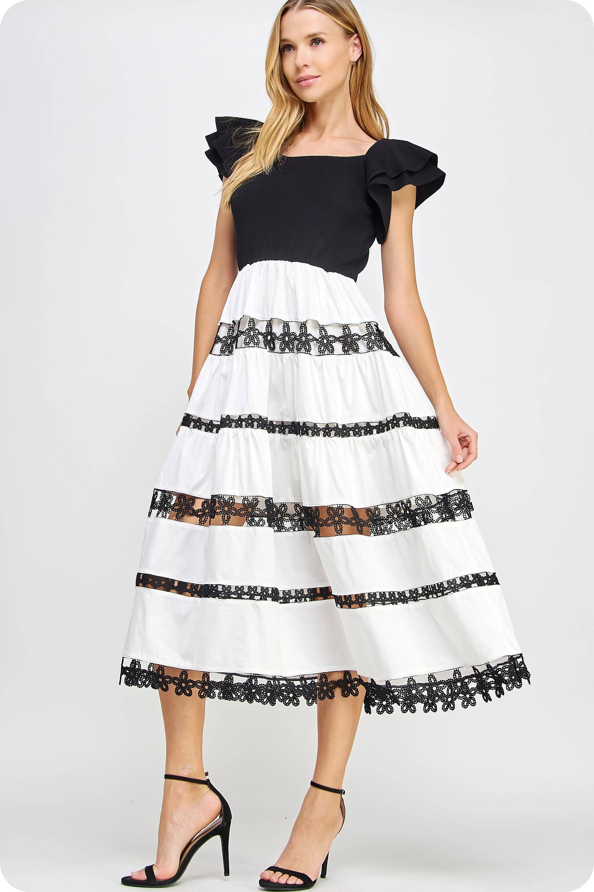 Mixed media lace trim detail midi dress in cotton poplin fabric and knitted fabrication. This style features a knit bodice with double ruffle sleeve, square neckline, midi skirt with scalloped lace trim, and half lining.