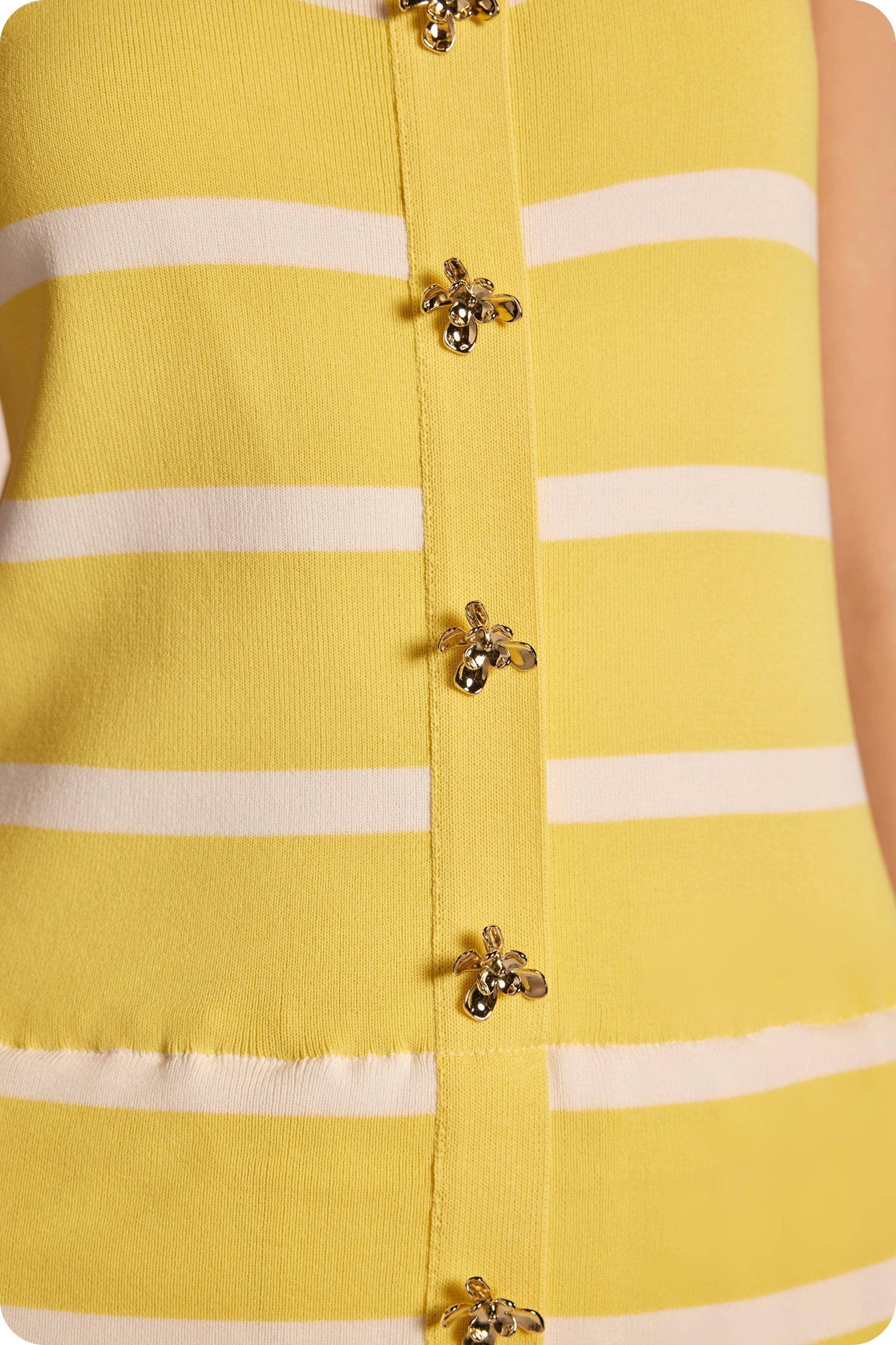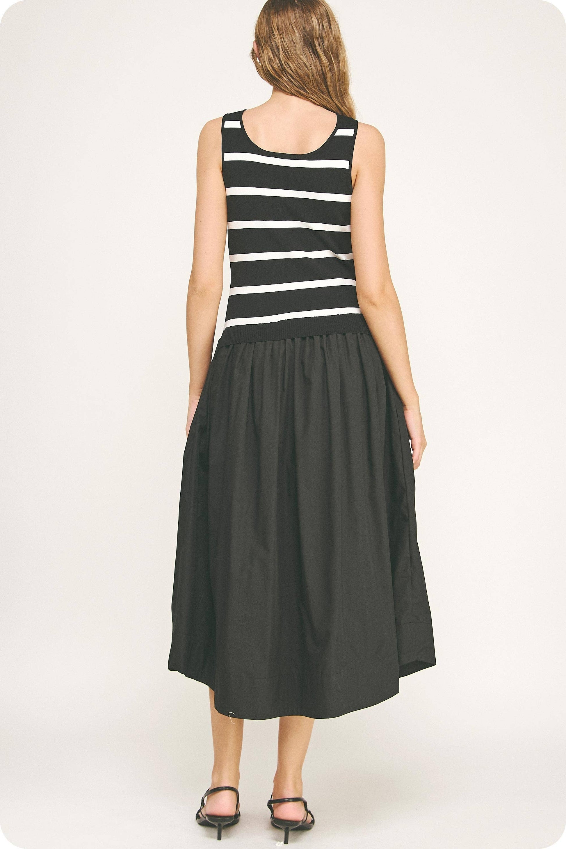 Strut and Bolt Collection. Mixed media midi dress in striped stretch knit fabric and poplin fabric. This versatile midi dress features a tank top bodice in knitted stripe fabric, a scoop neckline, metal flower button down detail at front, a long poplin skirt with shirring detail at waist, side pockets, lining, and a curved hem.
