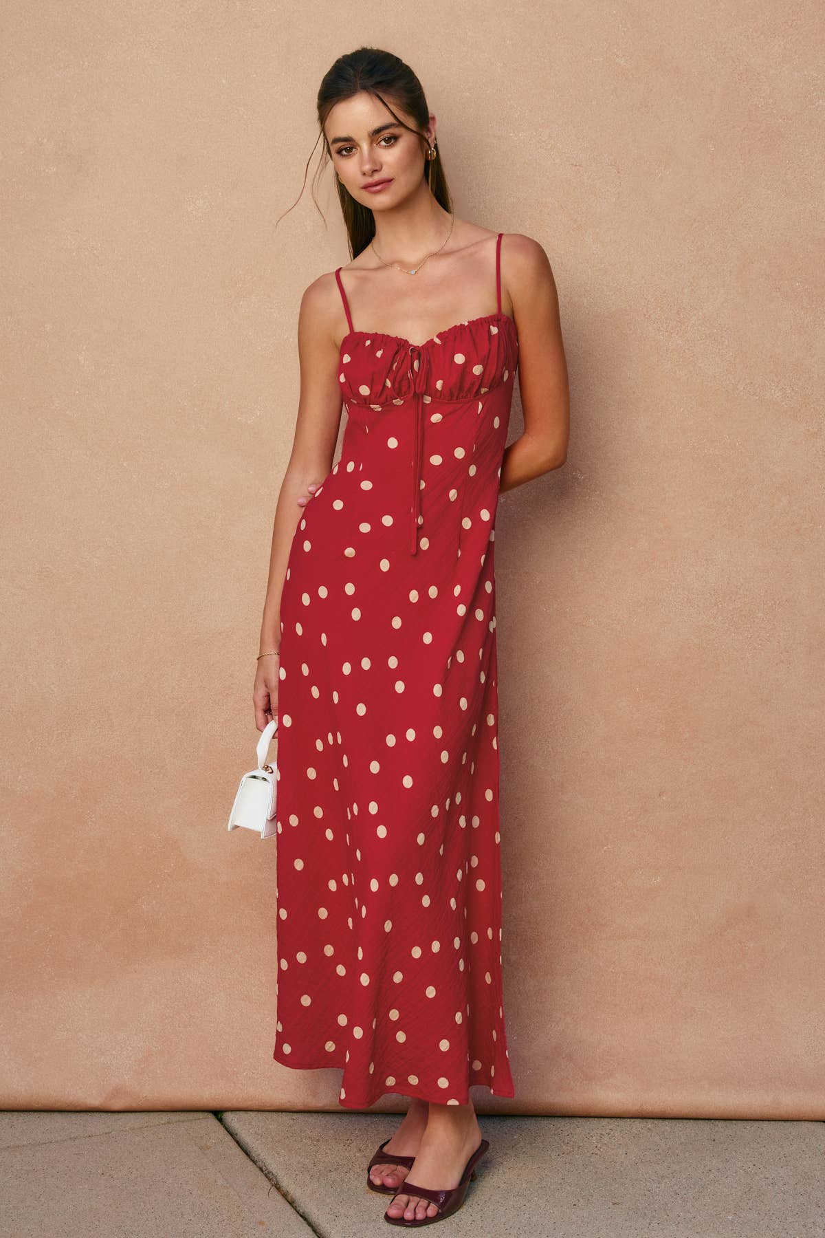 Polka dot print sleeveless maxi dress. Model is 5'8" and wearing size Small.