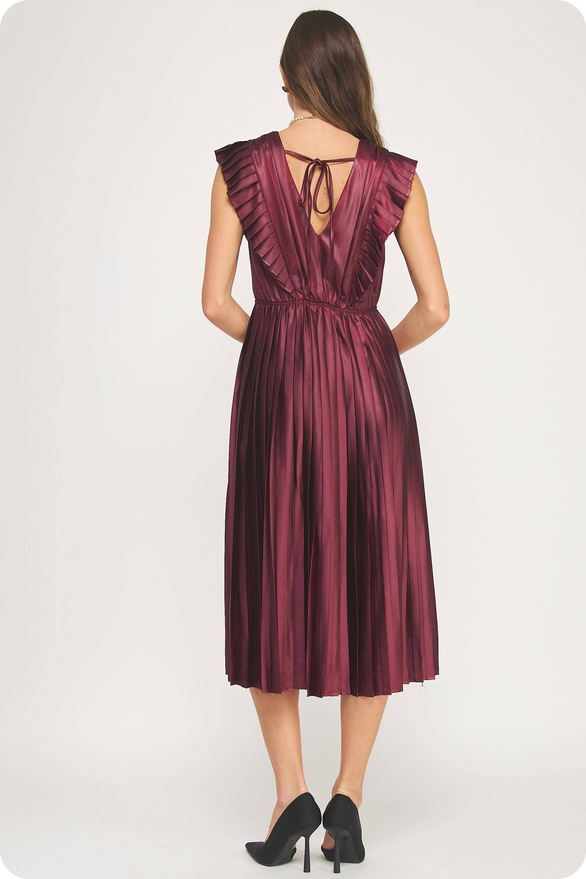 Sleeveless pleated ruffle midi dress in coated satin fabric. This sleeveless chic long dress features a front/back V neckline, pleated ruffled detail from shoulder to waist, cinched elastic waist, and tie closure at back. The perfect dress for an event or the holiday season.